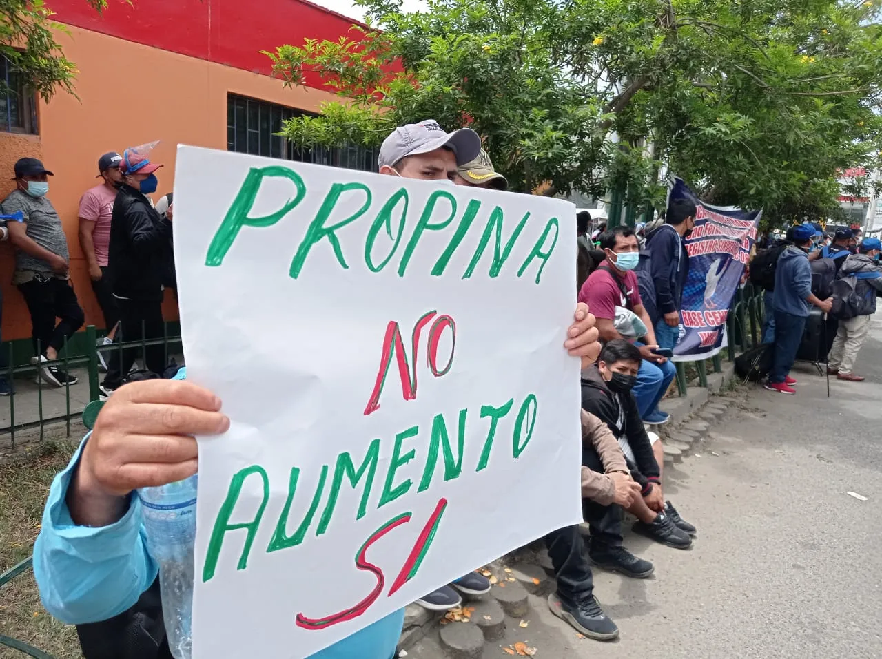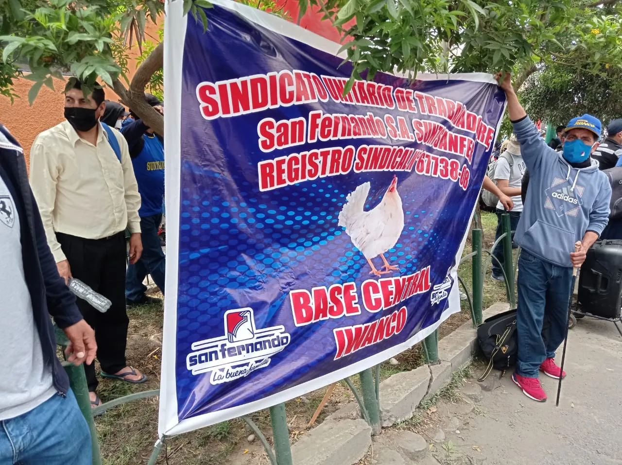 Un nutrido grupo de trabajadores de la avícola San Fernando realiza un plantón en el cruce de la avenida República de Panamá y la calle Portocarrero, en Surquillo, exigiendo aumentos justos de sueldo como parte del convenio colectivo de trabajo correspondiente al periodo 2021-2022.