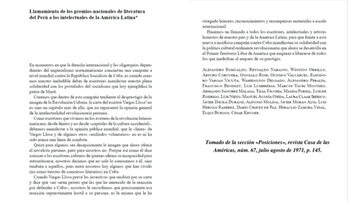 Un grupo de escritores y poetas peruanos dijo que la carta que Vargas Llosa envió a Santamaría “no representa la opinión general de la intelectualidad revolucionaria peruana” y solo fue un capítulo más en la “campaña tendiente al desprestigio de la imagen de la Revolución Cubana”. Quienes suscribieron este comunicado fueron Juan Gonzalo Rose, Alejandro Romualdo, Eleodoro Vargas Vicuña, Reynaldo Naranjo, Winston Orrillo, Arturo Corcuera, Gustavo Valcárcel, Washington Delgado, Alejandro Peralta, Francisco Bendezú, Luis Guillermo Lumbreras, Marcos Yauri, Tilsa Tsuchiya, Magda Portal, entre otros, quienes pidieron que demás intelectuales y artistas de Latinoamérica se solidaricen con la isla.