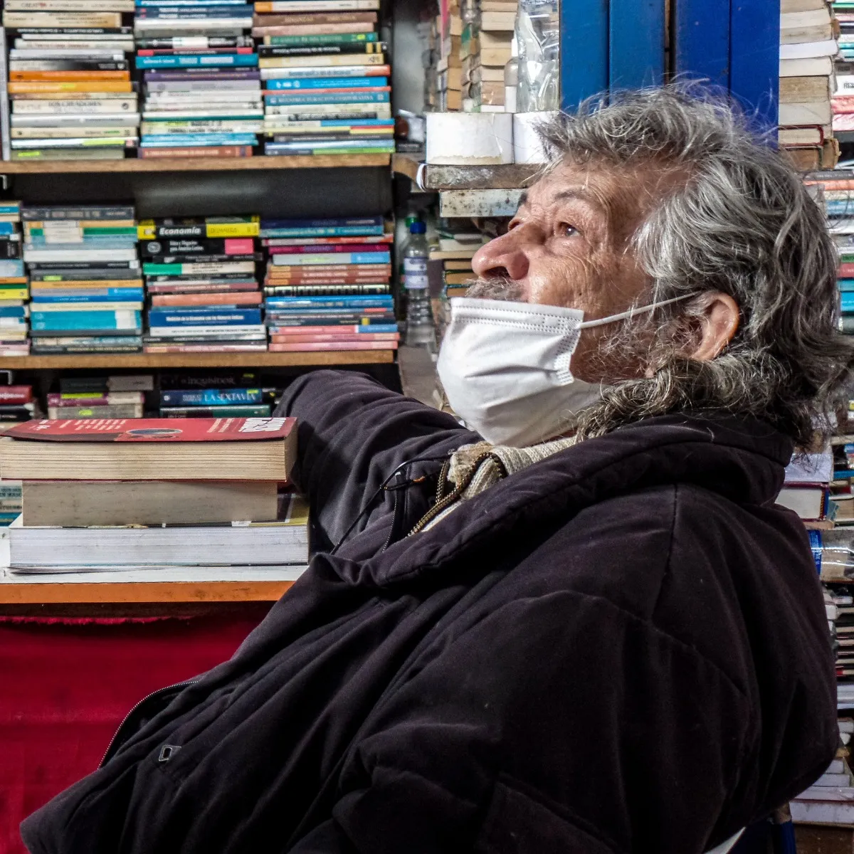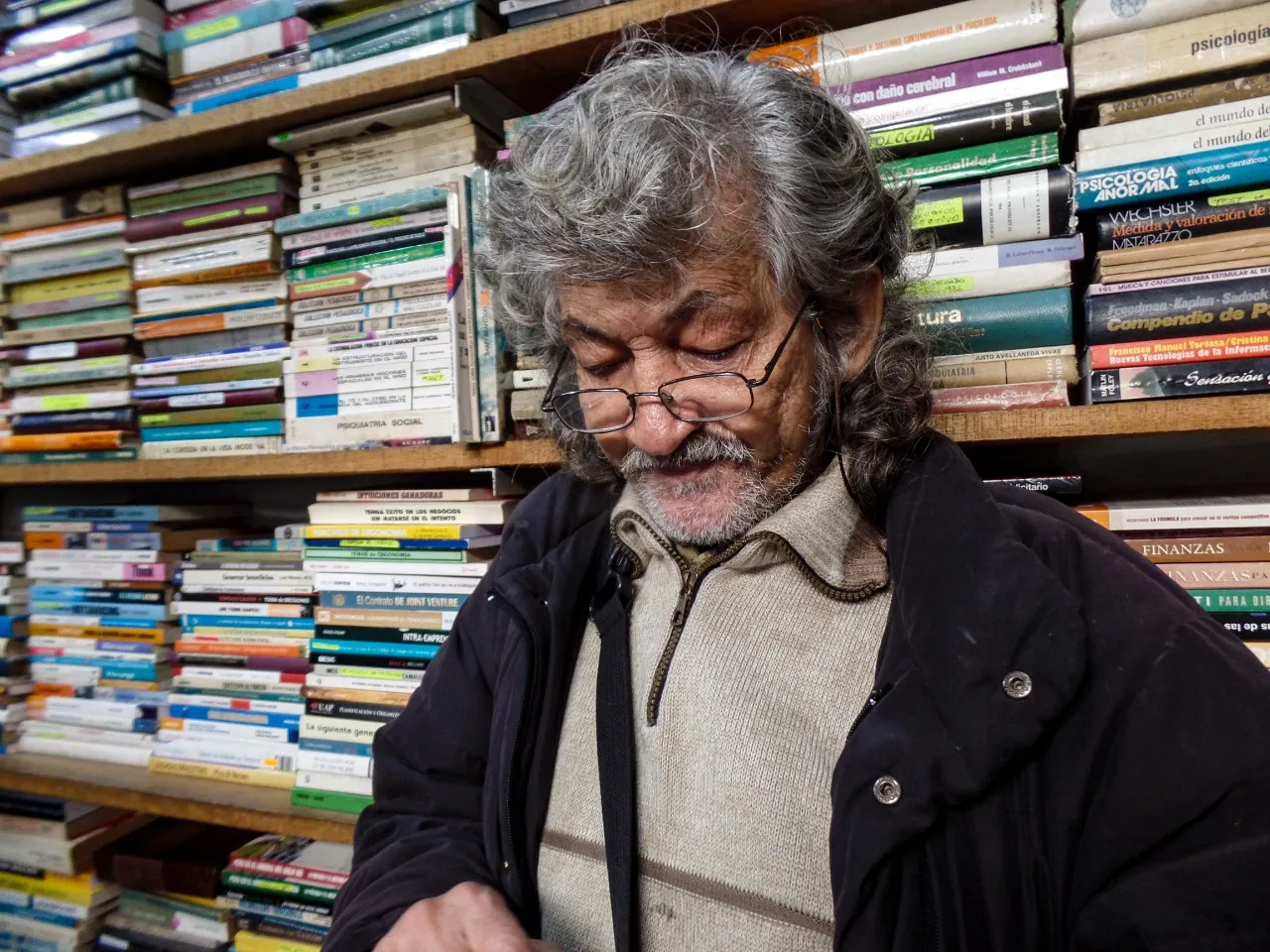 —Tenía que recursearme y vendí repartiendo mis libros a domicilio —revela el librero de cabellera blanca, casi dos metros de estatura y vientre liso, siempre vistiendo una camisa a cuadros o a rayas—. Ahora tengo que desahuevarme y empezar a vender por internet, porque sí se vende, sale algo. Estoy cagado porque no sé cómo se usan las redes sociales, pero tengo que aprender.