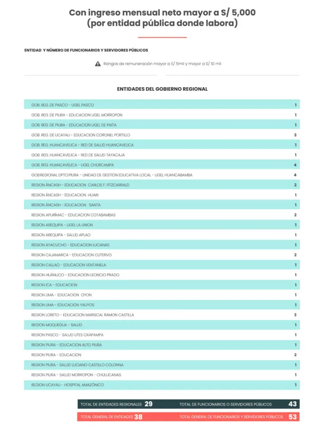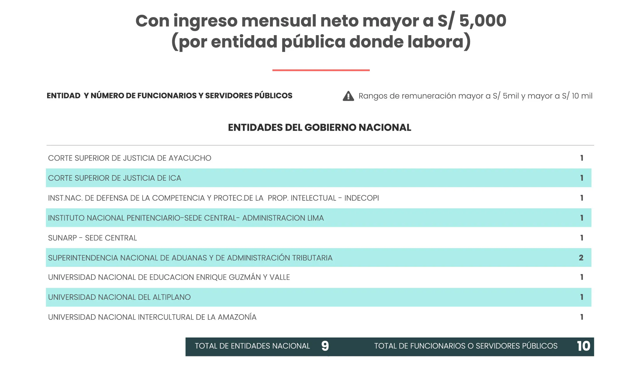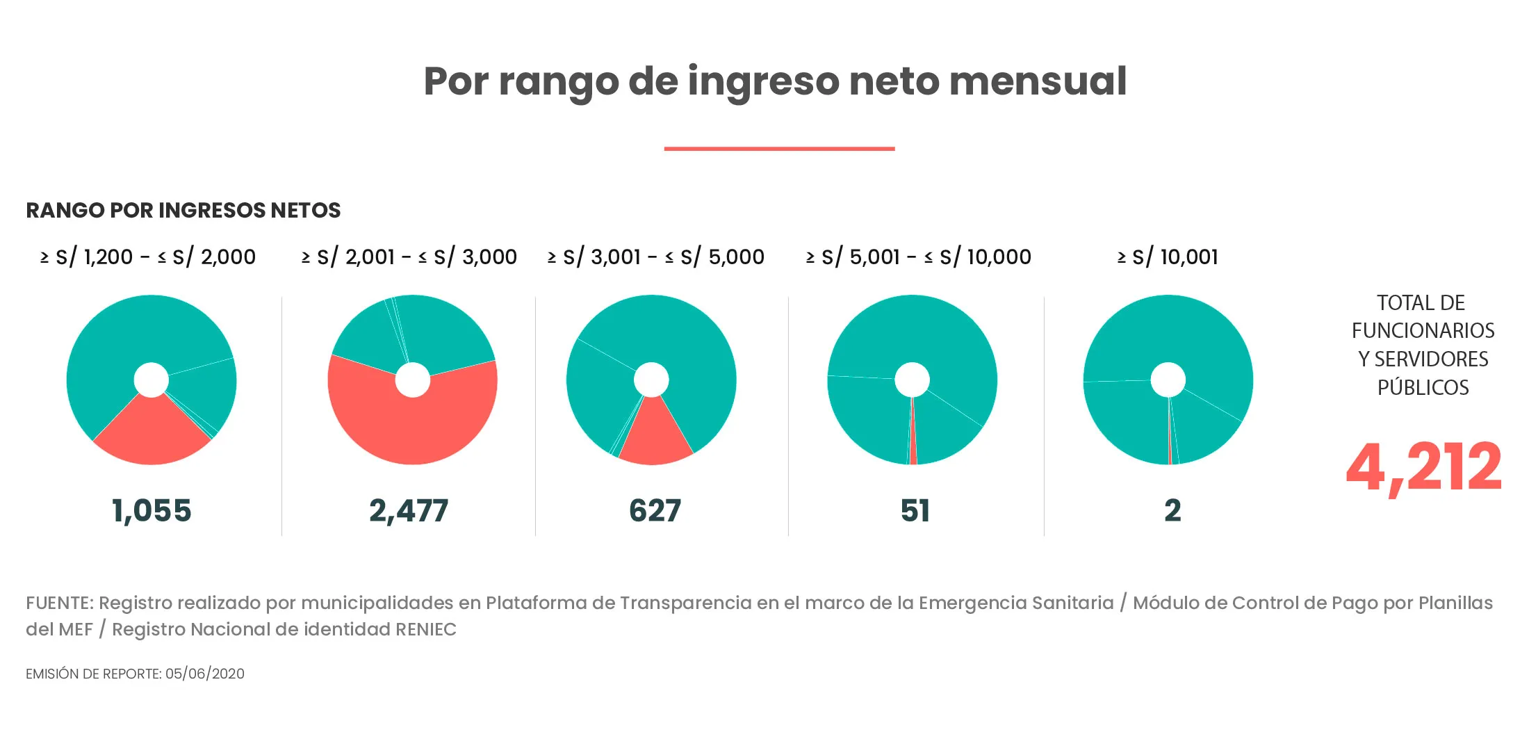 Concretamente 1.055 funcionarios que se vieron beneficiados con estas canastas ganan entre S/ 1.200 y S/ 2.000. Otros 2.477 ganan entre S/ 2.001 y S/ 3.000; un grupo de 627 funcionarios ganan entre S/ 3.001 y S/ 5.000; 51 entre S/ 5.001 y S/ 10.000 y 2 ganan más de S/ 10.001.