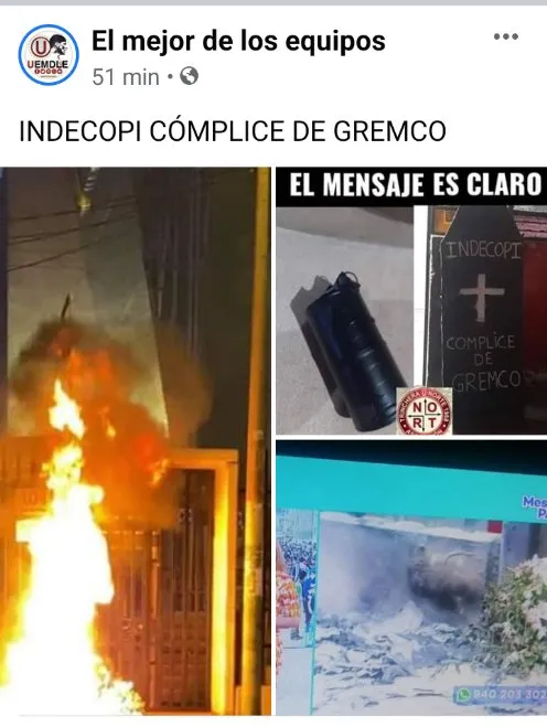 Indecopi publicó un comunicado en sus redes sociales en el que rechazó "enérgicamente el atentado ocurrido hoy" y exigió "a las autoridades una investigación exhaustiva para determinar quiénes son los autores materiales e intelectuales de este acto terrorista en quienes debe recaer todo el peso de la ley".