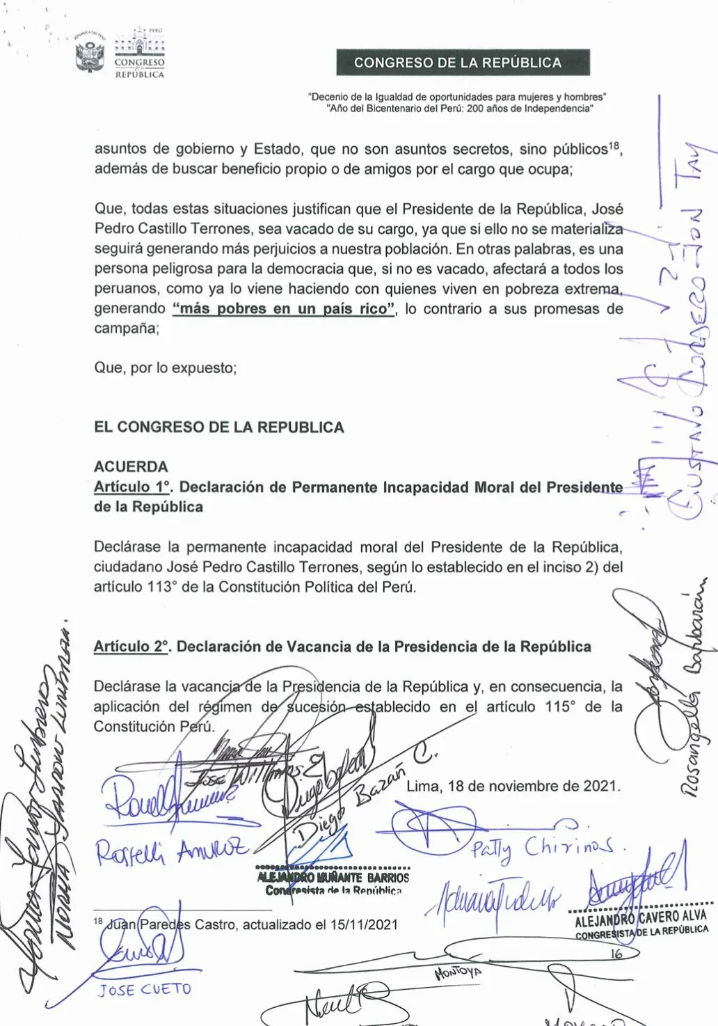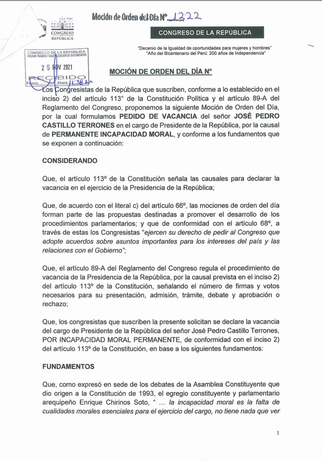 Con el apoyo de Fuerza Popular y Renovación Popular, la legisladora Patricia Chirinos, de Avanza País, ha logrado conseguir las 28 firmas requeridas y presentó hoy ante el Congreso la moción de vacancia contra el presidente Pedro Castillo.